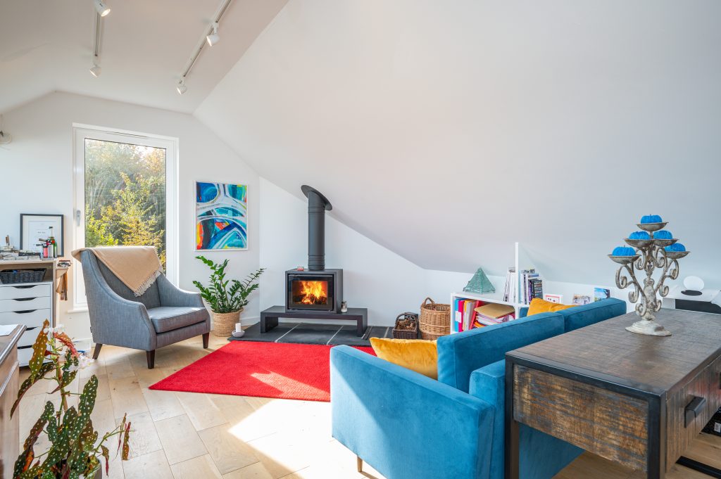 The first floor space over the garaging, provides a home office for our clients. The rooflights have been sized and positioned to allow the fantastic countryside views to be enjoyed from both a seated and standing position within the room. The room was fully re-built with new steelwork and timbers all of which have been fully insulated, exceeding the requirements of the Building regulations.