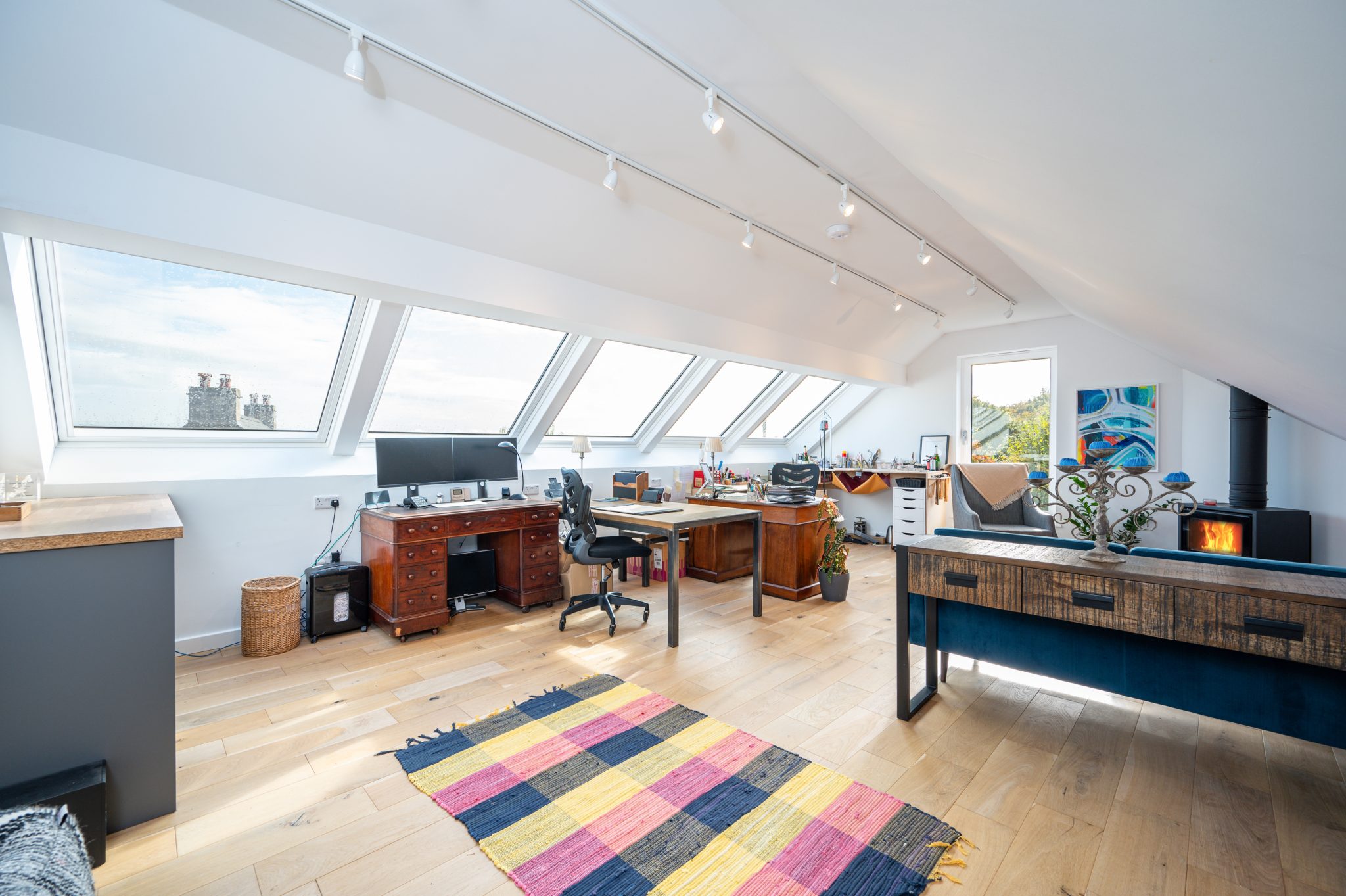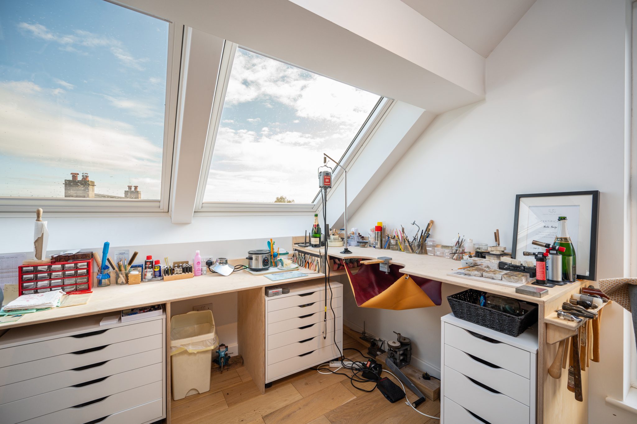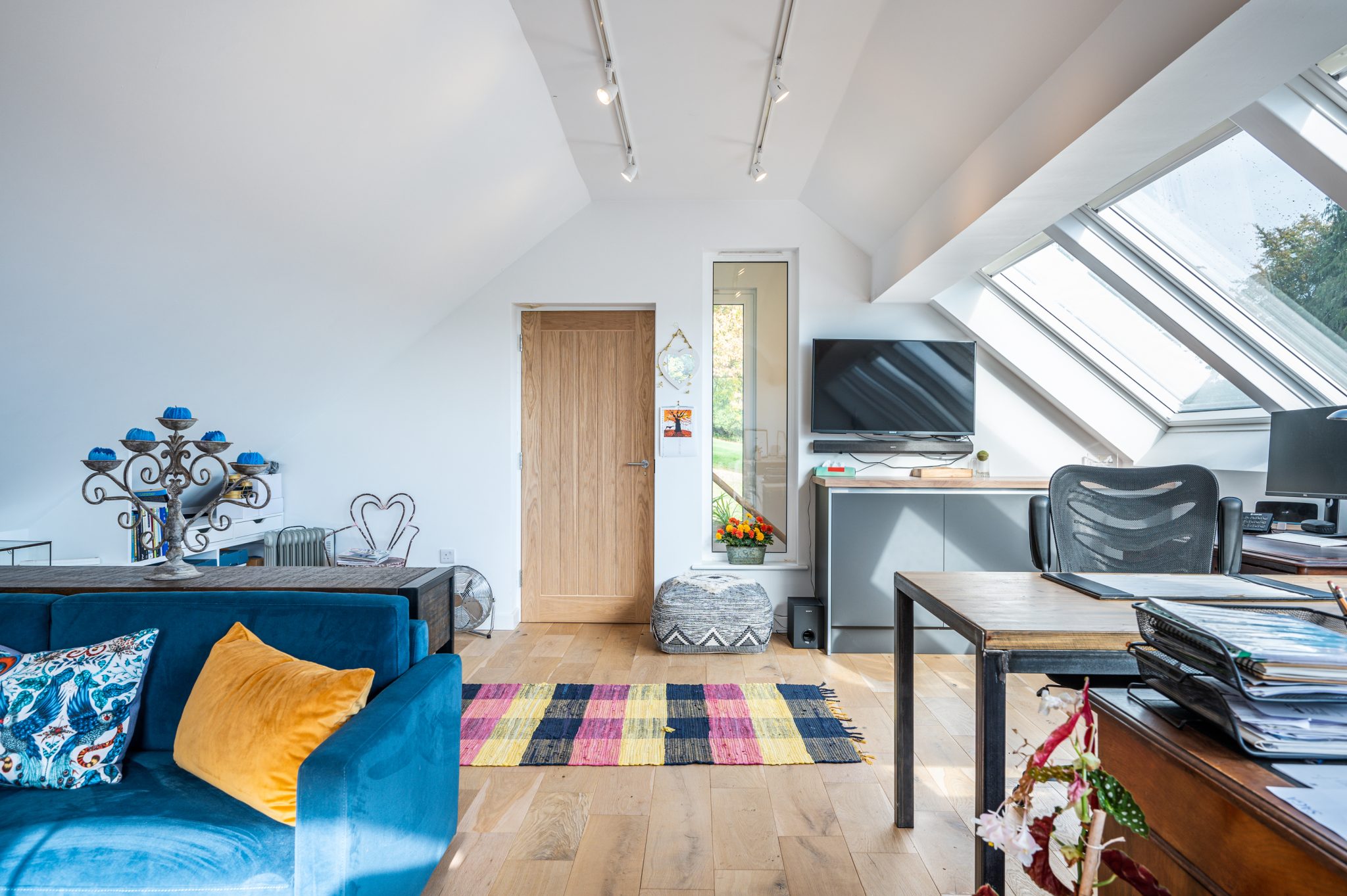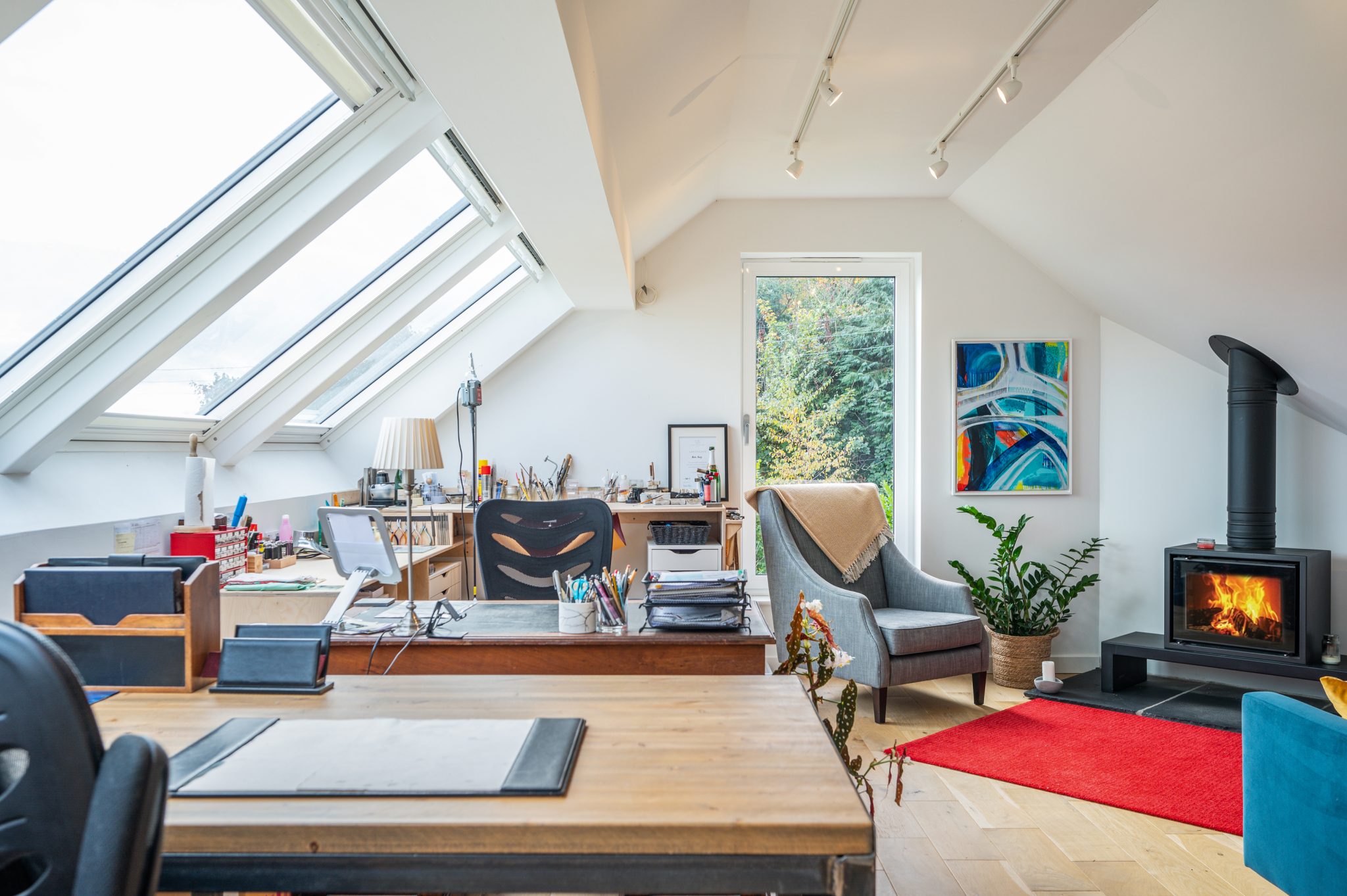 The first floor space over the garaging, provides a home office for our clients. The rooflights have been sized and positioned to allow the fantastic countryside views to be enjoyed from both a seated and standing position within the room. The room was fully re-built with new steelwork and timbers all of which have been fully insulated, exceeding the requirements of the Building regulations.